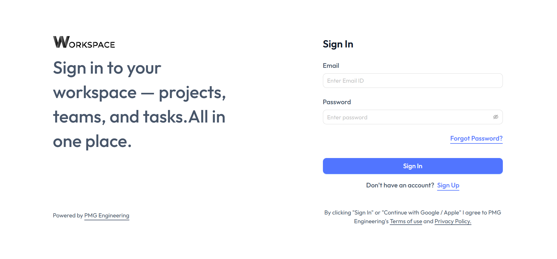 PMG Workspace is a digital platform that helps organizations manage projects, processes, and engineering tasks in one centralized environment. It enables teams to create and manage digital workspaces, access tools, collaborate with experts, and streamline operations for improved efficiency and better decision-making.